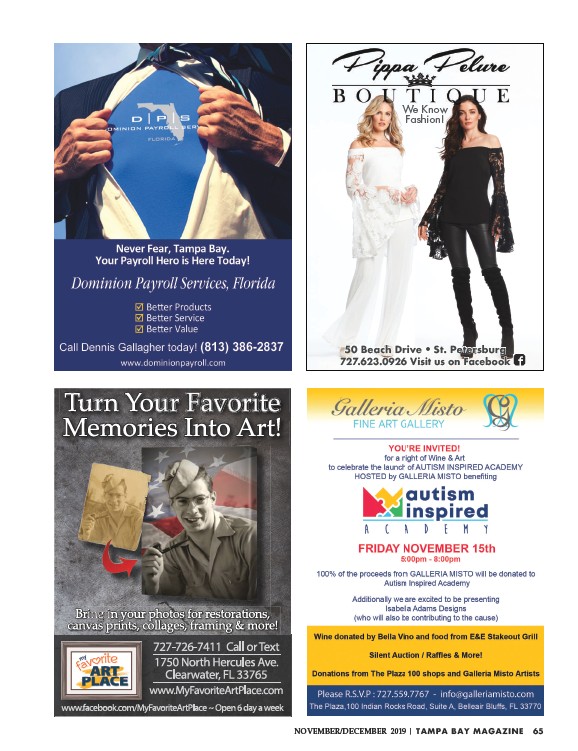 We Know Fashion! W K 50 Beach Drive • St. Petersburg 727.623.0926 Visit us on Facebook NOVEMBER/DECEMBER 2019 | TAMPA BAY MAGAZINE 65