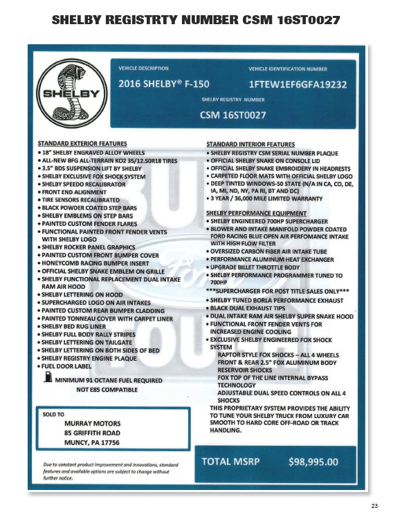 23 SHELBY REGISTRTY NUMBER CSM 16ST0027