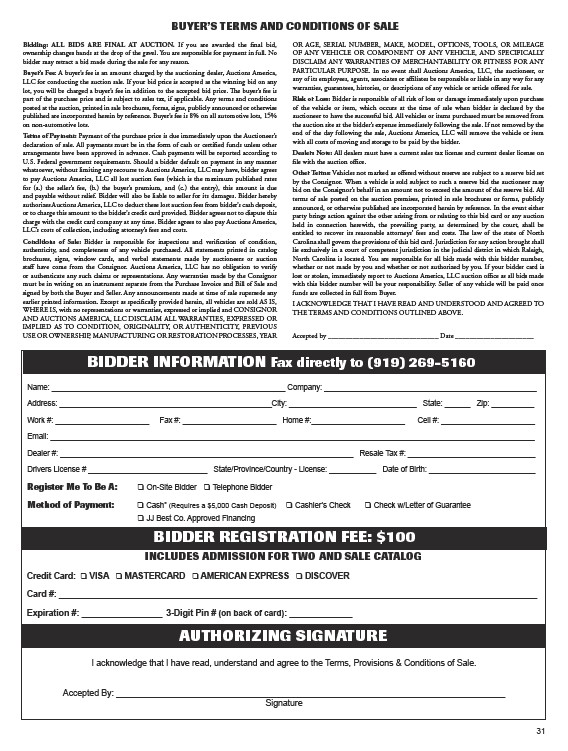 lost or stolen, immediately report to Auctions America, LLC auction office as all bids made