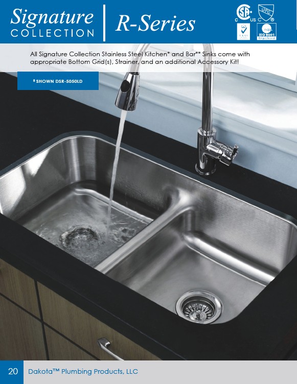 All Signature Collection Stainless Steel Kitchen* and Bar** Sinks come with appropriate Bottom Grid(s), Strainer, and an additional Accessory Kit! ‡ SHOWN DSR-5050LD 20 Dakota™ Plumbing Products, LLC