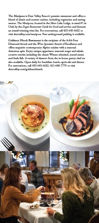 an award-winning wine list. For reservations, call 435-645-6632 or