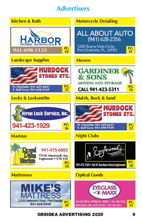 Advertisers Kitchen & Bath PG 40 GR8IDEA ADVERTISING 2020 9 Mattresses PG 39 Landscape Supplies PG 32 Marinas Movers PG 28 PG 19 PG 36 Locks & Locksmiths Motorcycle Detailing PG 41 Night Clubs PG 30 Mulch, Rock & Sand PG 32 Optical Goods PG 31