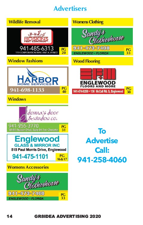 Advertisers Wood Flooring 14 GR8IDEA ADVERTISING 2020 PG 38 Womens Accessories PG 33 PG 33 To Advertise Call: 941-258-4060 Wildlife Removal PG 20 Windows PG 31 Womens Clothing Window Fashions PG 40 PG 16 & 17
