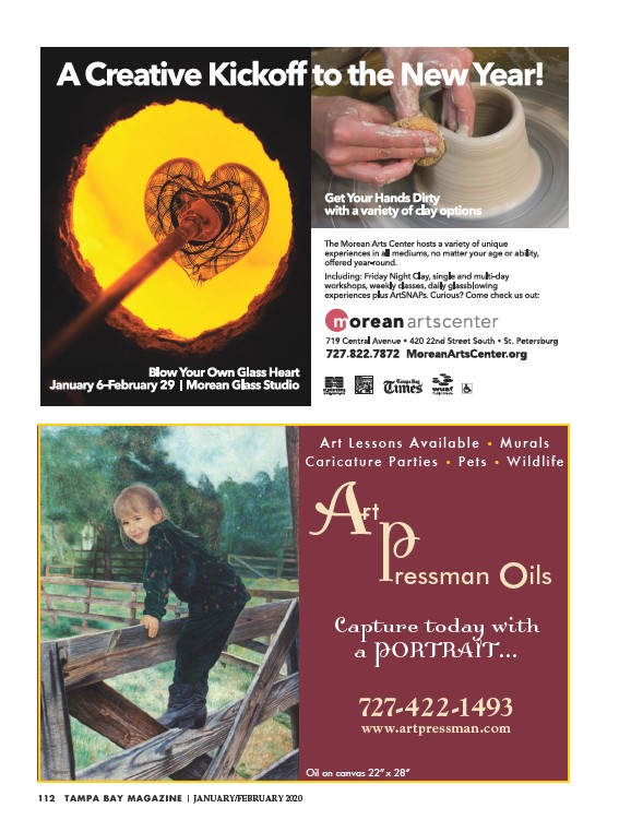 112 TAMPA BAY MAGAZINE | JANUARY/FEBRUARY 2020 Art Lessons Available • Murals Caricature Parties • Pets • Wildlife Oils Art ressman P Capture today with a PORTRAIT... 727-422-1493 www.artpressman.com Oil on canvas 22”x 28”
