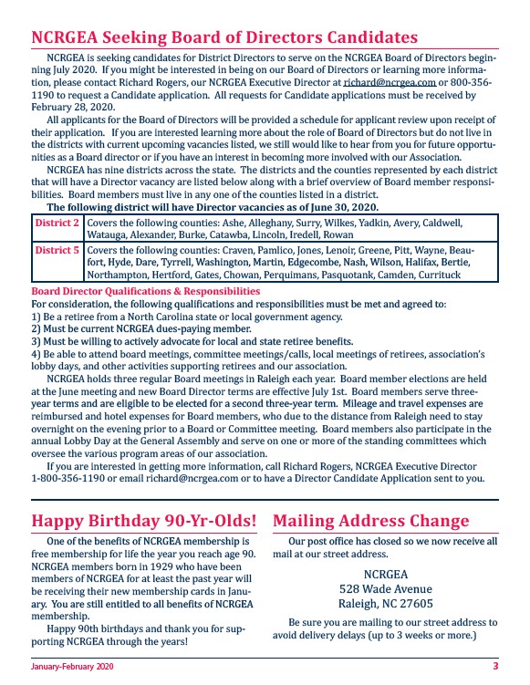 NCRGEA holds three regular Board meetings in Raleigh each year. Board member elections are held