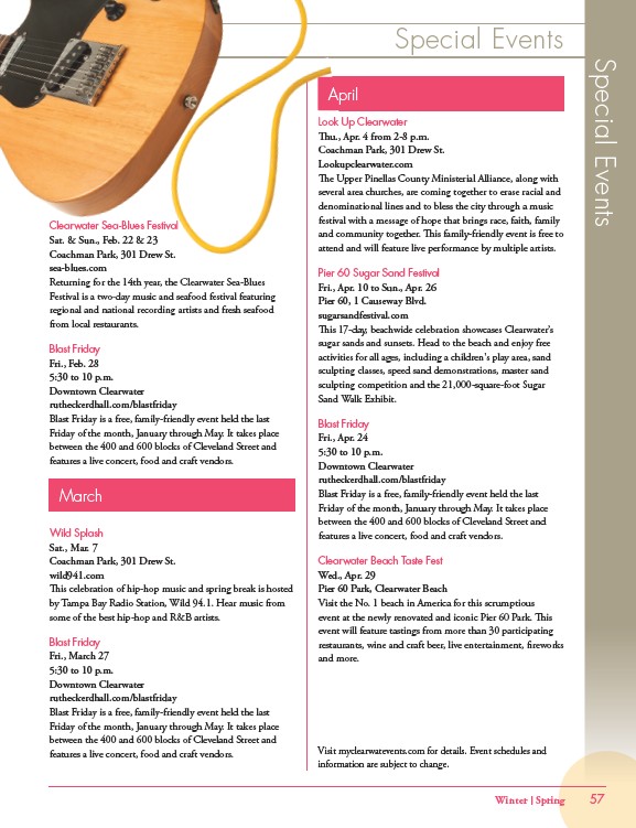 features a live concert, food and craft vendors. Visit myclearwatevents.com for details. Event schedules and