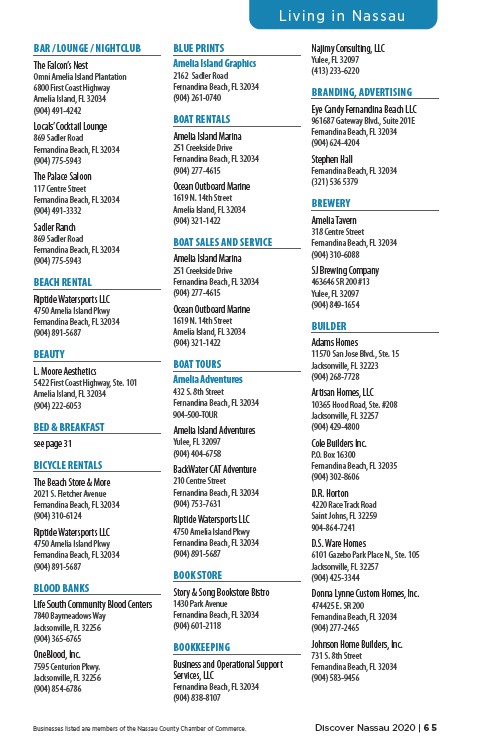 Businesses listed are members of the Nassau County Chamber of Commerce. Discover Nassau 2020 | 65
