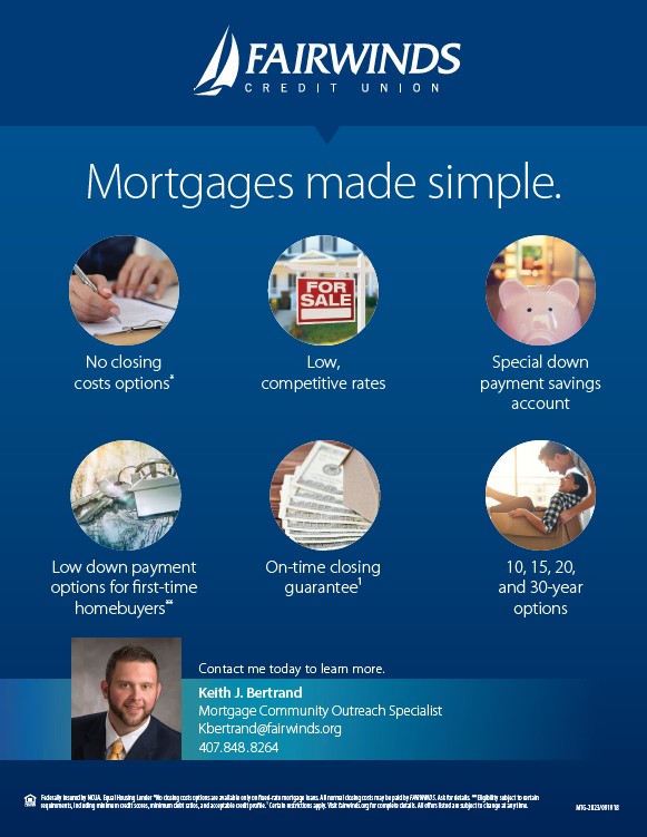 Federally insured by NCUA. Equal Housing Lender *No closing costs options are available only on fixed-rate mortgage loans. All normal closing costs may be paid by FAIRWINDS. Ask for details. **Eligibility subject to certain