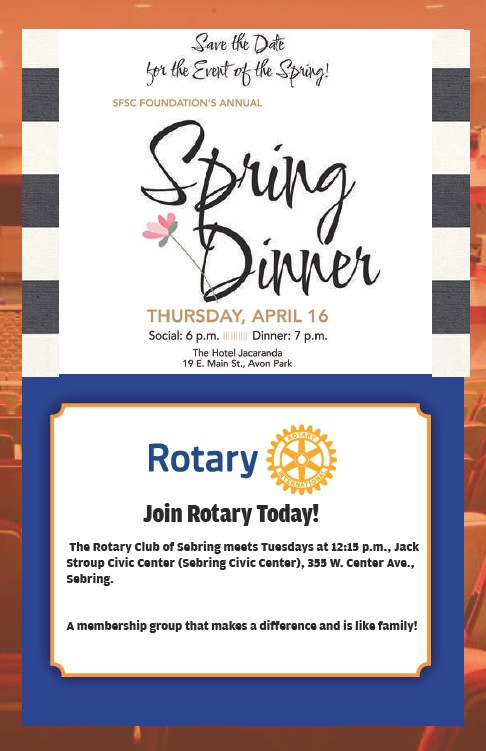 Join Rotary Today! The Rotary Club of Sebring meets Tuesdays at 12:15 p.m., Jack Stroup Civic Center (Sebring Civic Center), 355 W. Center Ave., Sebring. A membership group that makes a difference and is like family!