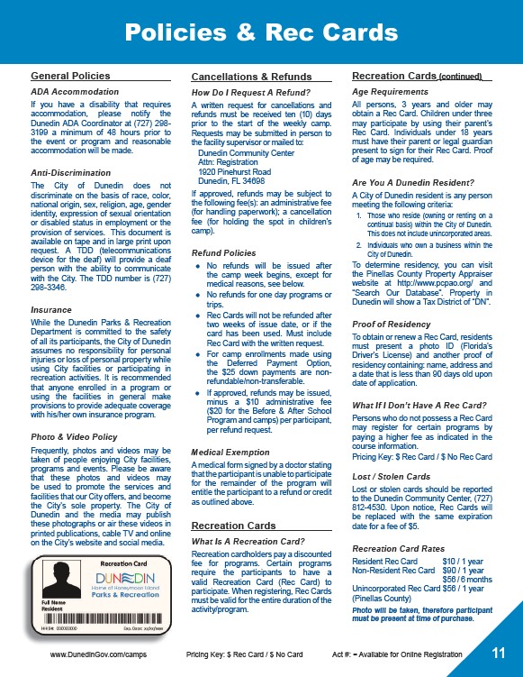 www.DunedinGov.com/camps Pricing Key: $ Rec Card / $ No Card Act #: = Available for Online Registration