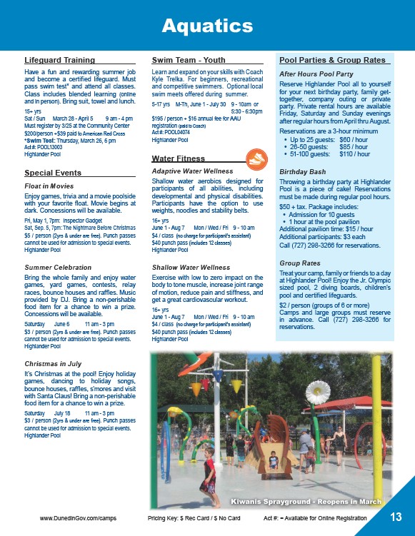 www.DunedinGov.com/camps Pricing Key: $ Rec Card / $ No Card Act #: = Available for Online Registration