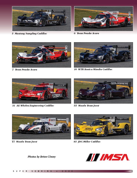 5 Mustang Sampling Cadillac 6 Team Penske Acura 7 Team Penske Acura 10 WTR Konica Minolta Cadillac 31 AE Whelen Engineering Cadillac 55 Mazda Team Joest 77 Mazda Team Joest 85 JDC-Miller Cadillac Photos by Brian Cleary 19