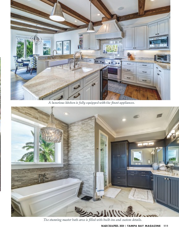 A luxurious kitchen is fully equipped with the finest appliances. The stunning master bath area is filled with built-ins and custom details. MARCH/APRIL 2020 | TAMPA BAY MAGAZINE 111