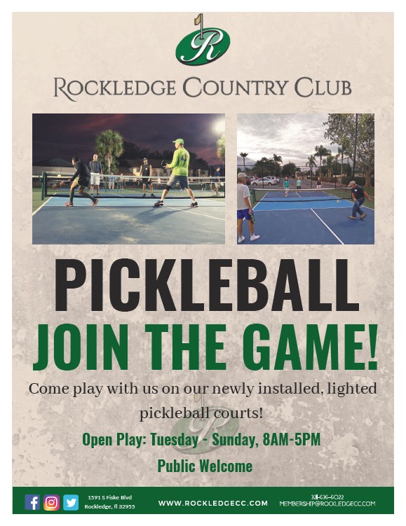 PICKLEBALL JOIN THE GAME! Come play with us on our newly installed, lighted pickleball courts! Open Play: Tuesday - Sunday, 8AM-5PM 1591 S Fiske Blvd Rockledge, fl 32955 Public Welcome