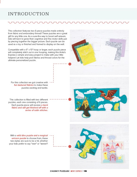 Compatible with a 6" x 10" hoop or larger, each puzzle piece