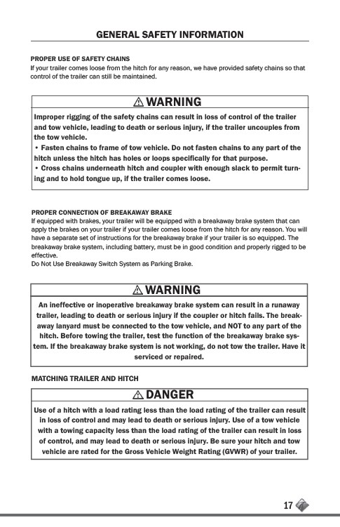 trailer, leading to death or serious injury if the coupler or hitch fails. The breakaway