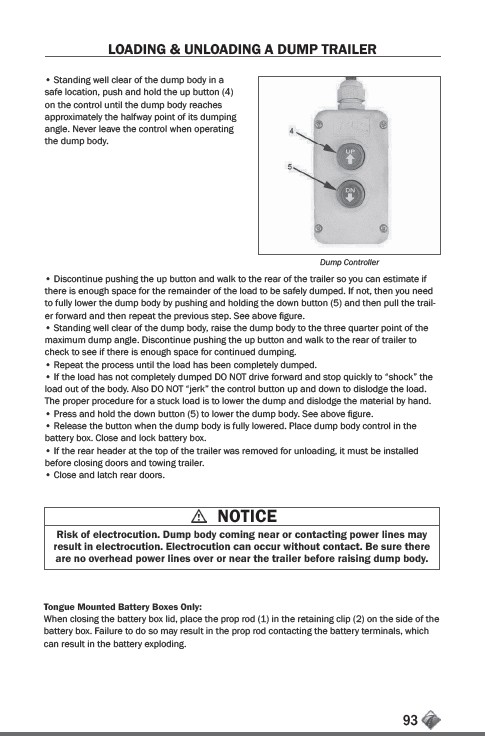 maximum dump angle. Discontinue pushing the up button and walk to the rear of trailer to