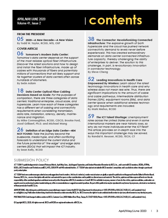 ICT TODAY is published quarterly in January/February/March, April/May/June, July/August/September, and October/November/December by BICSI, Inc., and is sent to BICSI members, RCDDs, RTPMs,