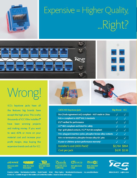Premise Cables . Workstation Outlets . Patch Panels . RCM . Fiber Optics . Residential Enclosures . icc.com/distributor 888.ASK.4ICC . cs@icc.com