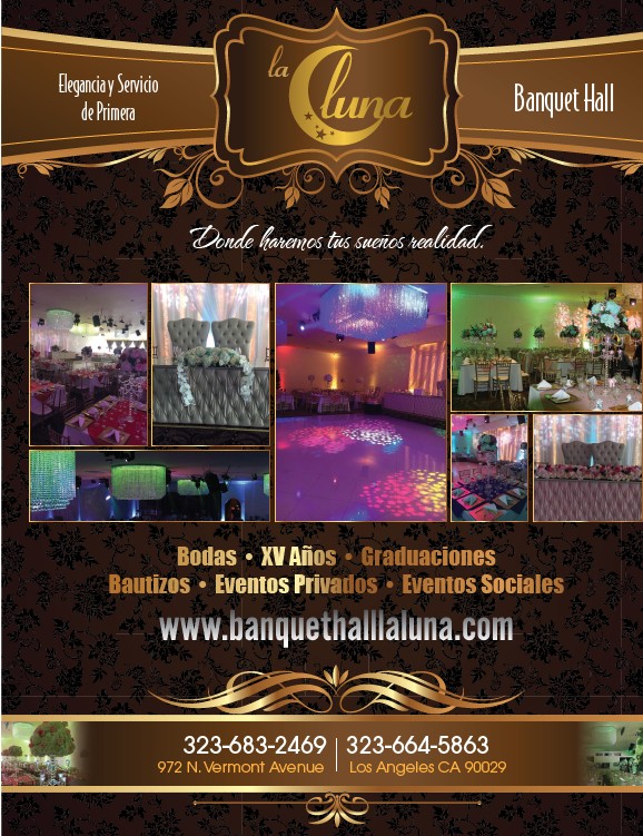 Elegancia y Servicio de Primera Banquet Hall Donde haremos tus sueños realidad. Bodas • XV Años • Graduaciones Bautizos • Eventos Privados • Eventos Sociales 323-683-2469 323-664-5863 972 N. Vermont Avenue Los Angeles CA 90029