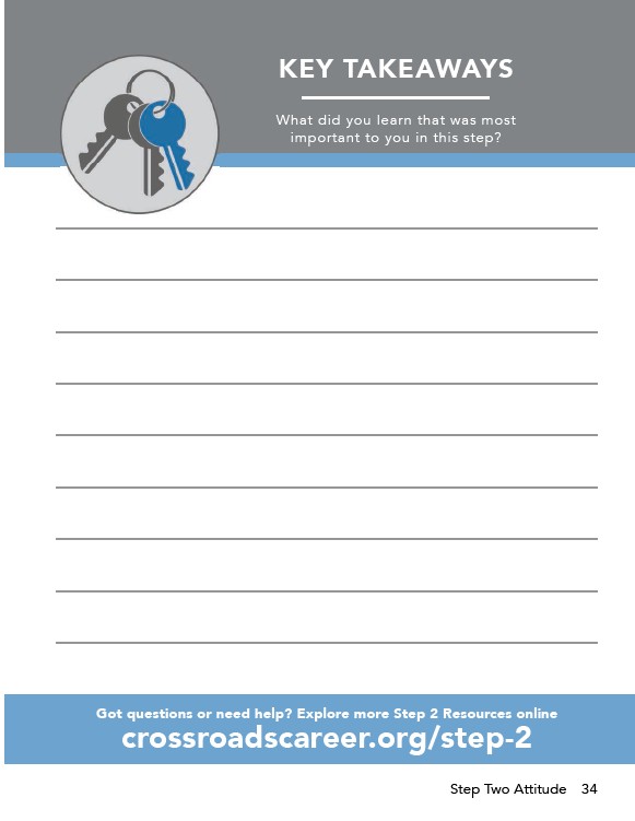 KEY TAKEAWAYS What did you learn that was most important to you in this step? Got questions or need help? Explore more Step 2 Resources online crossroadscareer.org/step-2 Step Two Attitude 34
