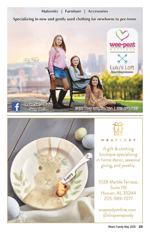 Bham Family May 2020 25 Maternity | Furniture | Accessories Specializing in new and gently used clothing for newborns to pre-teens Mon-Sat, 10-6 Sun, 11-3 5479 Hwy 280, Ste 124 | 205.874.6655