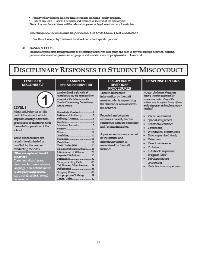 Note: Any confiscated items will be released to parent or legal guardian only. Levels 1-4.