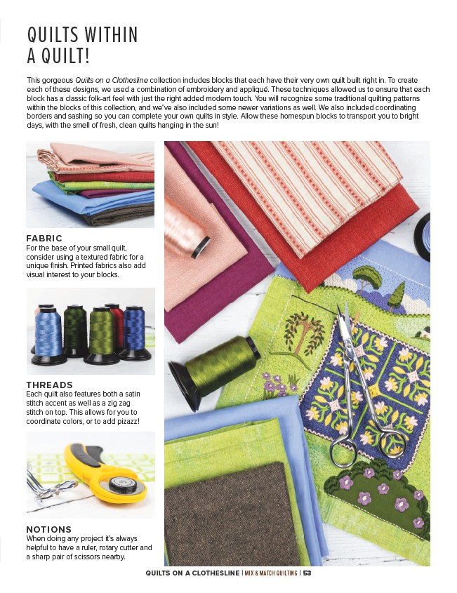 This gorgeous Quilts on a Clothesline collection includes blocks that each have their very own quilt built right in. To create