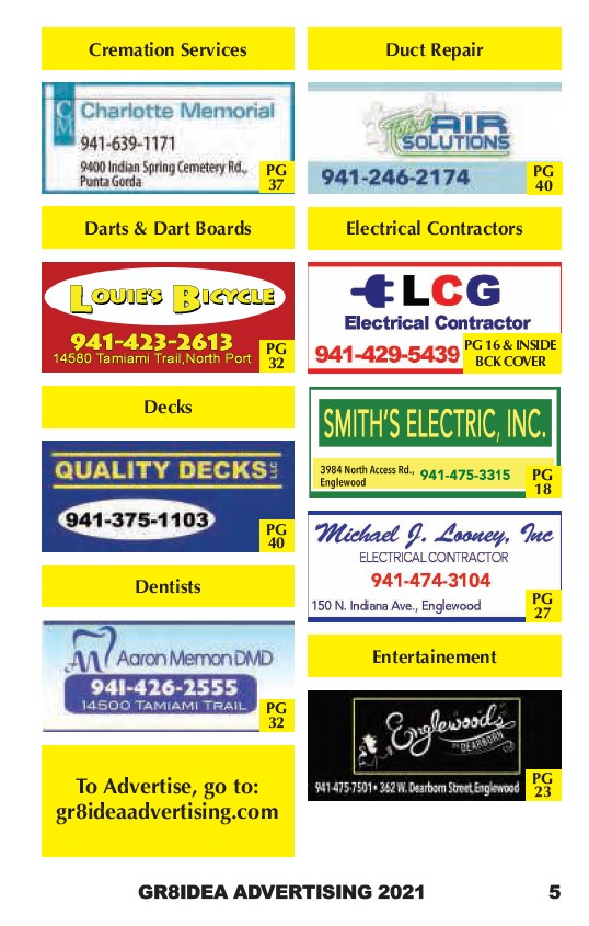 Cremation Services Darts & Dart Boards Decks Dentists Duct Repair Electrical Contractors PG 16 & INSIDE BCK COVER Entertainement PG 37 PG 32 PG 40 PG 32 To Advertise, go to: gr8ideaadvertising.com PG 40 PG 18 PG 27 PG 23 GR8IDEA ADVERTISING 2021 5
