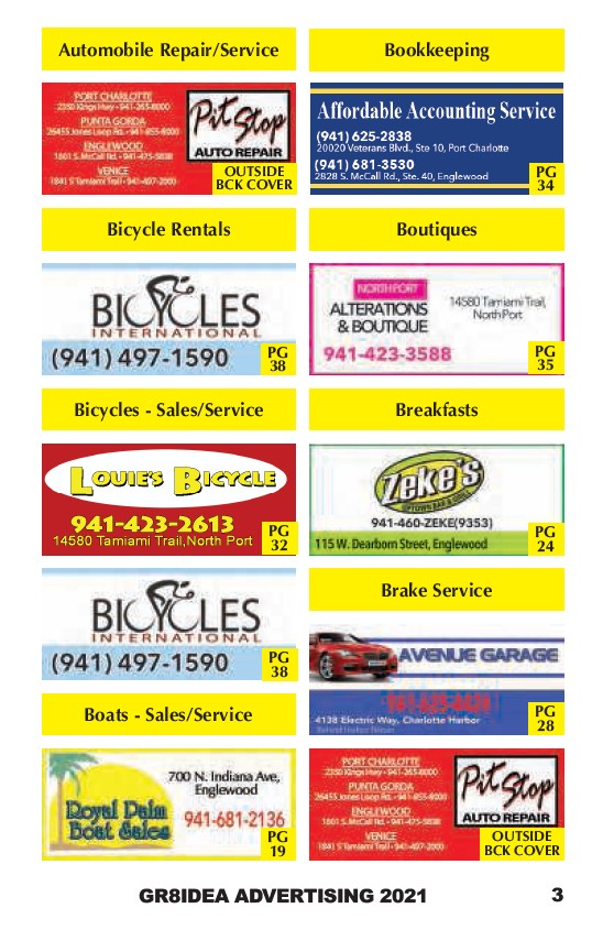 Automobile Repair/Service OUTSIDE BCK COVER Bicycle Rentals Bicycles - Sales/Service Boats - Sales/Service Bookkeeping Boutiques Breakfasts Brake Service PG 34 PG 38 PG 35 PG 32 PG 24 PG 38 PG 28 PG 19 OUTSIDE BCK COVER GR8IDEA ADVERTISING 2021 3