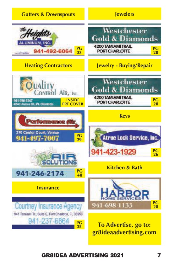 Gutters & Downspouts Heating Contractors Insurance Jewelers Jewelry - Buying/Repair Keys Kitchen & Bath PG 20 PG 20 PG 26 PG 28 To Advertise, go to: gr8ideaadvertising.com PG 33 INSIDE FRT COVER PG 29 PG 40 PG 25 GR8IDEA ADVERTISING 2021 7