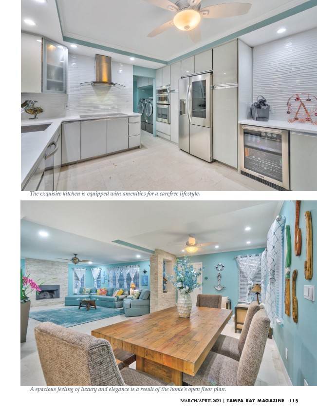 The exquisite kitchen is equipped with amenities for a carefree lifestyle. A spacious feeling of luxury and elegance is a result of the home’s open floor plan. MARCH/APRIL 2021 | TAMPA BAY MAGAZINE 115