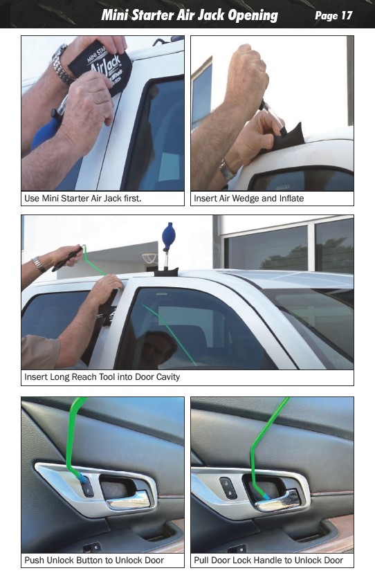 Page 17 Mini Starter Air Jack Opening Insert Long Reach Tool into Door Cavity Push Unlock Button to Unlock Door Pull Door Lock Handle to Unlock Door