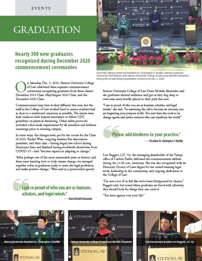 Stetson University President Dr. Christopher F. Roellke Stetson University College of Law Dean Michèle Alexandre Commencement speaker Lori Baggett, J.D. ‘02