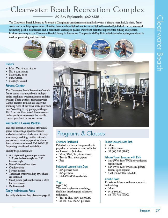 The Clearwater Beach Library & Recreation Complex is a modern recreation facility with a library, social hall, kitchen, fitness