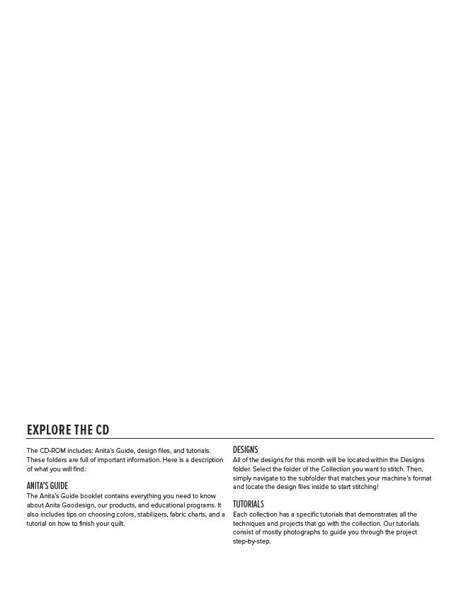 The CD-ROM includes: Anita’s Guide, design files, and tutorials.