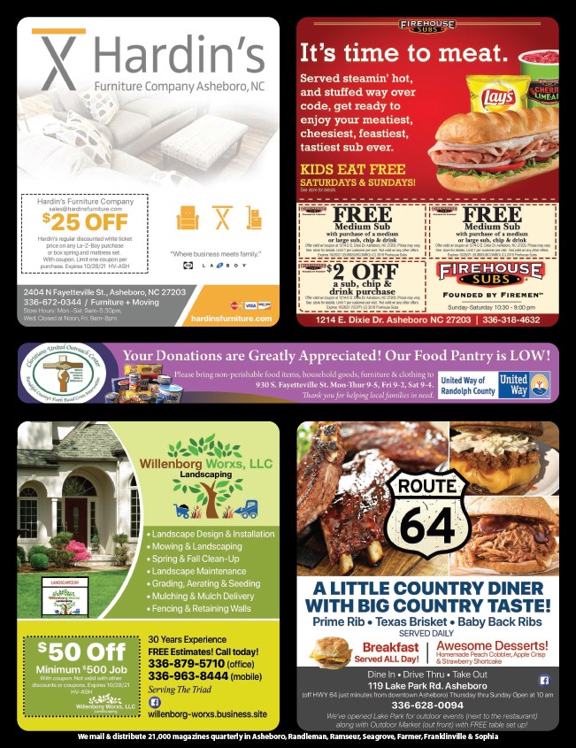 We mail & distribute 21,000 magazines quarterly in Asheboro, Randleman, Ramseur, Seagrove, Farmer, Franklinville & Sophia