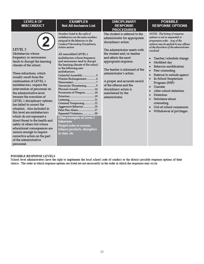 School level administrators have the right to implement the local school code of conduct or the district possible response options of their