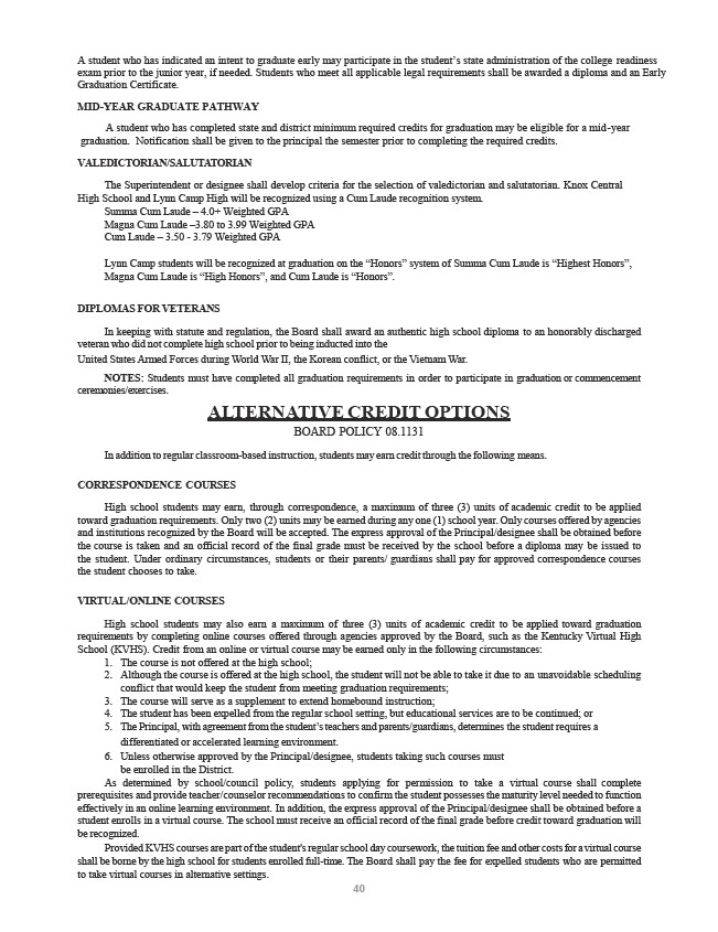 The Superintendent or designee shall develop criteria for the selection of valedictorian and salutatorian. Knox Central