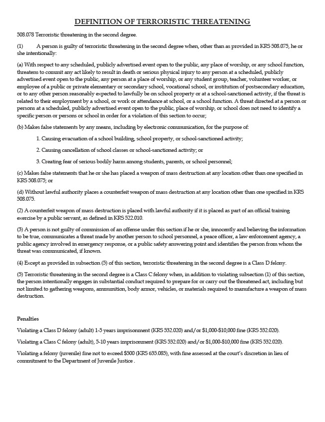(1) A person is guilty of terroristic threatening in the second degree when, other than as provided in KRS 508.075, he or