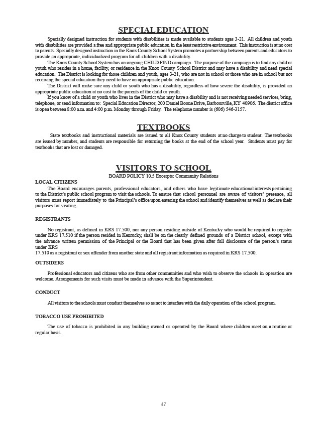 telephone, or send information to: Special Education Director, 200 Daniel Boone Drive, Barbourville, KY 40906. The district office