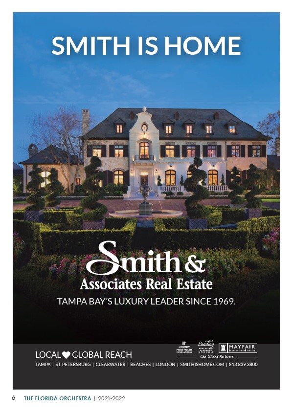 SMITH IS HOME TAMPA BAY’S LUXURY LEADER SINCE 1969. LOCAL ♥ GLOBAL REACH Our Global Partners TAMPA | ST. PETERSBURG | CLEARWATER | BEACHES | LONDON | SMITHISHOME.COM | 813.839.3800 THE FLORIDA ORCHESTRA | 2021-2022 6