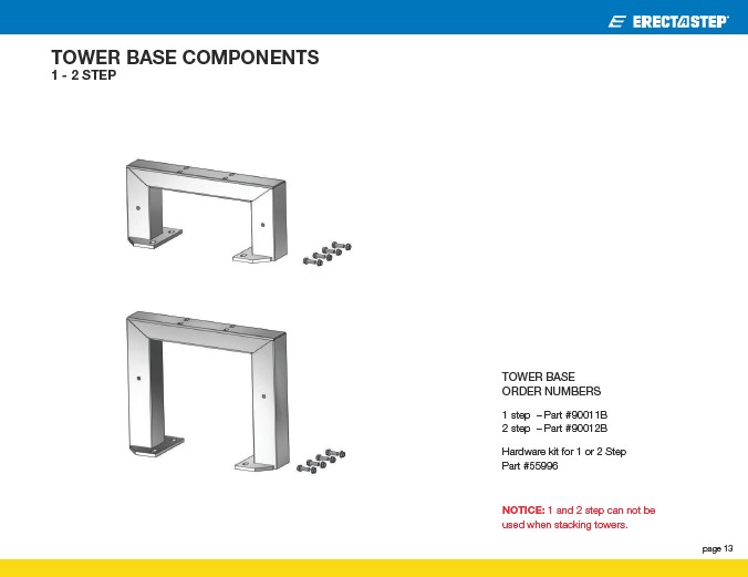 TOWER BASE COMPONENTS 1 - 2 STEP TOWER BASE ORDER NUMBERS 1 step – Part #90011B 2 step – Part #90012B Hardware kit for 1 or 2 Step Part #55996 NOTICE: 1 and 2 step can not be used when stacking towers. page 13