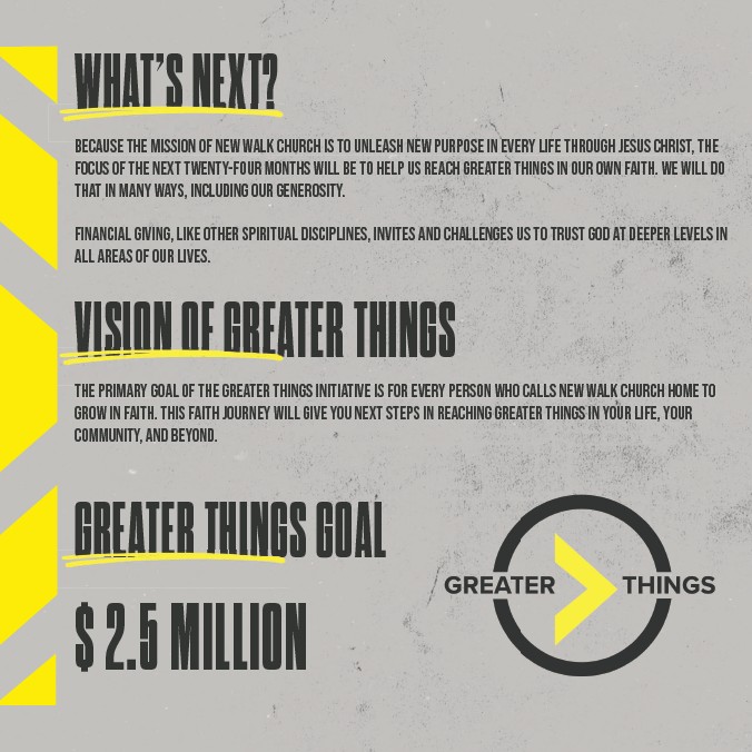 focus of the next twenty-four months will be to help us reach GREATER THINGS in our own faith. We will do