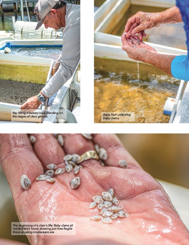 Ray lifting a nursery bed, checking on the stages of clam growth. The beginning of a clam’s life: Baby clams sit inside Barry’s hand, showing just how fragile these amazing crustaceans are. Barry Hurt collecting baby clams.