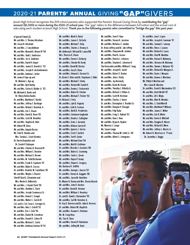 Jesuit High School recognizes the 209 school parents who supported the Parents’ Annual Giving Drive by contributing the “gap”