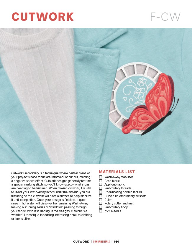 ☐ Wash-Away stabilizer ☐ Base fabric ☐ Appliqué fabric ☐ Embroidery threads ☐ Coordinating bobbin thread ☐ Curved tip embroidery scissors ☐ Ruler ☐ Rotary cutter and mat ☐ Embroidery hoop ☐ 75/11 Needle
