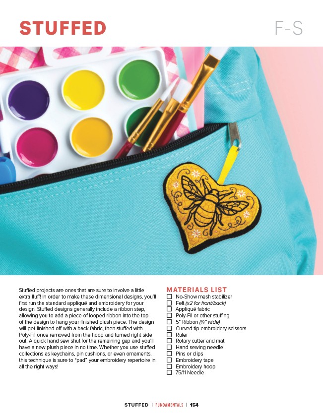 ☐ No-Show mesh stabilizer ☐ Felt (x2 for front/back) ☐ Appliqué fabric ☐ Poly-Fil or other stuffing ☐ 5” Ribbon (1⁄4” wide) ☐ Curved tip embroidery scissors ☐ Ruler ☐ Rotary cutter and mat ☐ Hand sewing needle ☐ Pins or clips ☐ Embroidery tape ☐ Embroidery hoop ☐ 75/11 Needle