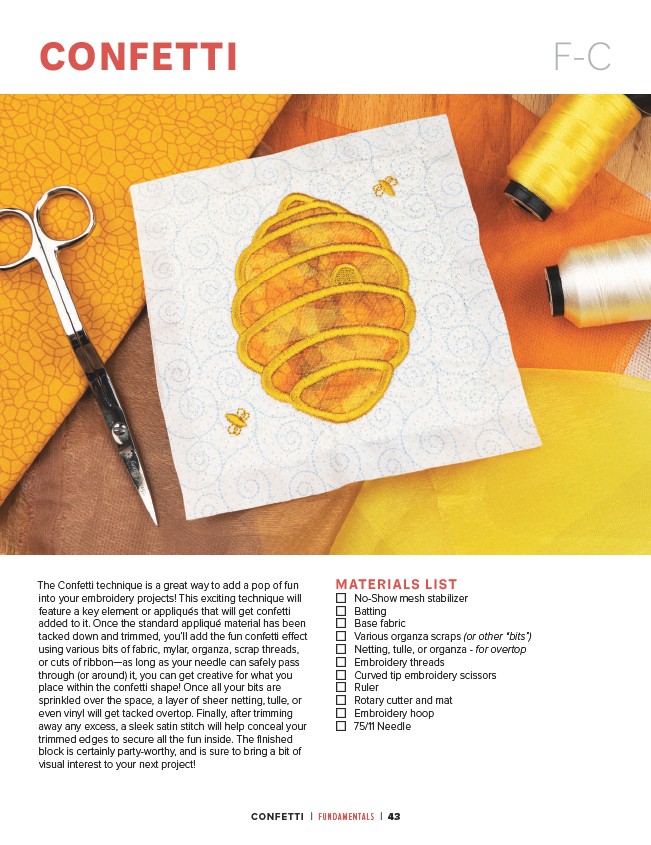 ☐ No-Show mesh stabilizer ☐ Batting ☐ Base fabric ☐ Various organza scraps (or other “bits”) ☐ Netting, tulle, or organza - for overtop ☐ Embroidery threads ☐ Curved tip embroidery scissors ☐ Ruler ☐ Rotary cutter and mat ☐ Embroidery hoop ☐ 75/11 Needle
