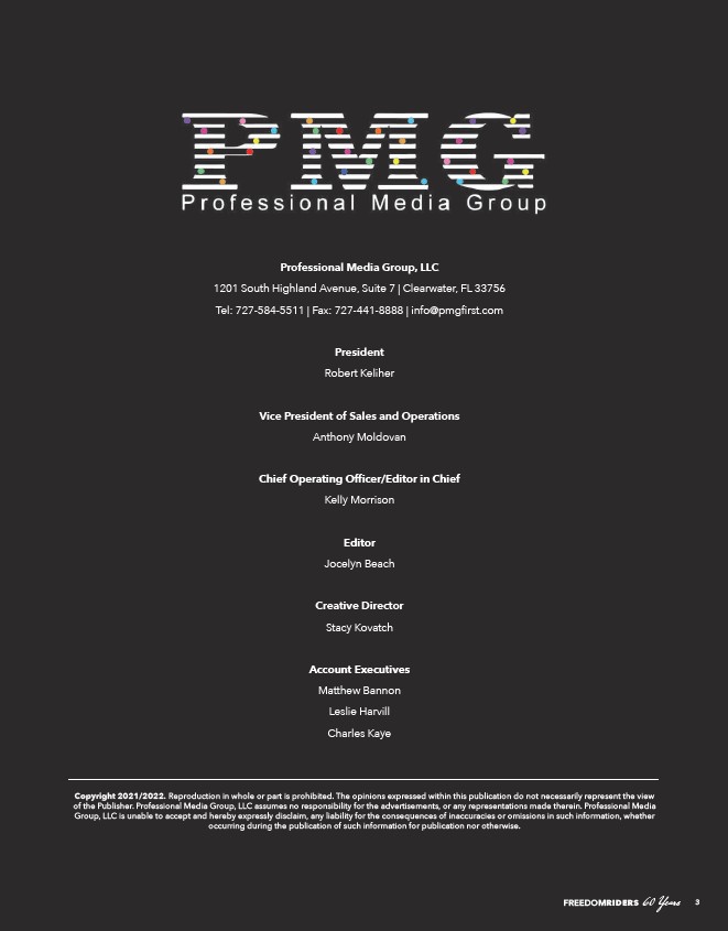 Professional Media Group, LLC 1201 South Highland Avenue, Suite 7 | Clearwater, FL 33756 President Robert Keliher Vice President of Sales and Operations Anthony Moldovan Creative Director FREEDOMRIDERS 60 Years 3